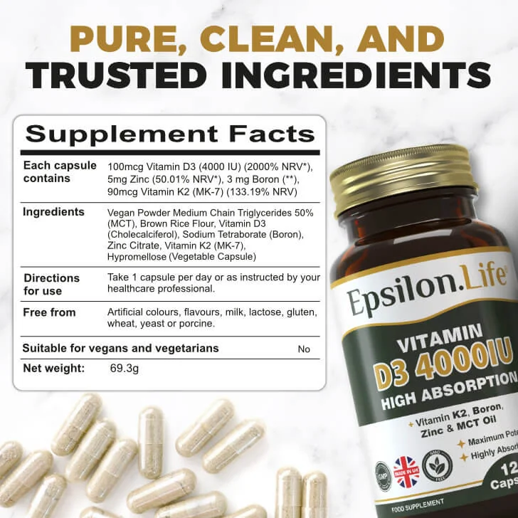 Vitamina D3 4000IU con Vitamina K2, Zinc, Boro y Aceite MCT para una óptima absorción