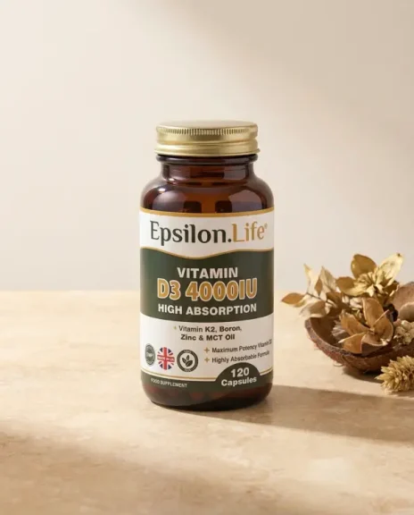 View Epsilon Life Vitamin D3K2 – high-strength 4,000 IU D3, 90mcg all-trans MK-7, zinc citrate, boron and MCT oil in a single daily capsule. No fillers. Made in the UK to GMP and BRCGS standards.